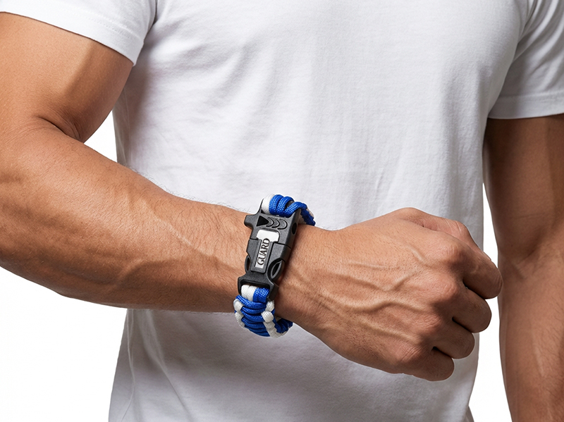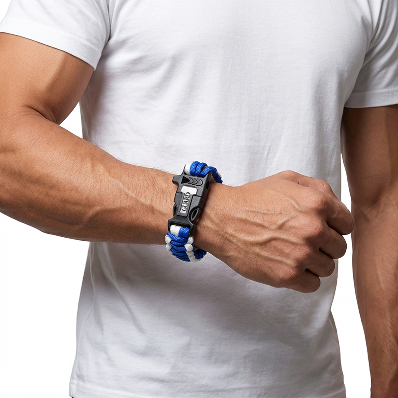 スターオブライフとGUARDロゴを刻印した、本格派パラコードブレスレット。一見おしゃれなアクセサリーですが、緊急時には3つの機能を発揮する「着けられるサバイバルキット」です。